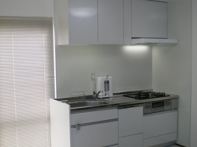 室内を圧迫している壁を撤去し、システムキッチンを新規で設置するだけでなく、向きも変えてスペースの確保に生かしました。室内全体の色調も茶系から白系をベースにした物に変更し、明るくかつ開放的なダイニングキッチンに仕上げました。